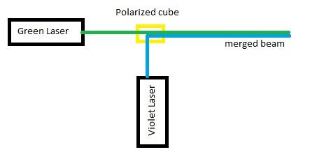 One of the challenge you will face, is merging the green and violet beam together, you will need a polarized beam that merge or divert the beam: